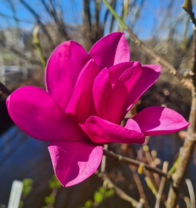 Магнолія "Ред Смайл" (Magnolia Red Smile) — це компактний листопадний сорт голландської селекції з винно-червоними, келихоподібними квітками. Висота дорослої рослини сягає 2,5–3,5 м, ширина — до 2,5 м, що робить її ідеальною для невеликих садів. Цвіте рясно навесні (квітень-травень) до появи листя, морозостійкість до -26°C.
